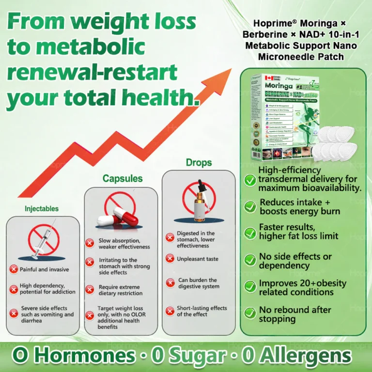✅ Hoprime®𝑴𝒐𝒓𝒊𝒏𝒈𝗮 · 𝗕𝗲𝗿𝗯𝗲𝗿𝙞𝙣𝙚 × 𝙉𝘼𝐃+ 𝟏𝟎-𝐢𝐧-𝟏 𝗔𝗱𝘃𝗮𝗻𝗰𝙚𝙙 𝙉𝙖𝙣𝙤 𝙈𝙞𝙘𝙧𝙤𝙣𝙚𝙚𝐝𝐥𝐞 𝐏𝐚𝐭𝙘𝙝 breaking away from the burden of traditional injectable or oral weight-loss products, this advanced nano microneedle transdermal delivery system gently and steadily releases active ingredients for up to 8 hours. Core ingredients Moringa and Berberine work synergistically to support appetite management and lipid metabolism, making fat loss feel more natural and effortless—without extreme dieting or physical strain. At the same time, NAD⁺ supports cellular energy levels and skin firmness, helping maintain a healthy, well-toned appearance during body-weight changes. The overall formula is gentle and stable, offering a more comfortable experience for those seeking an effective, non-irritating, and non-injectable approach to weight management.